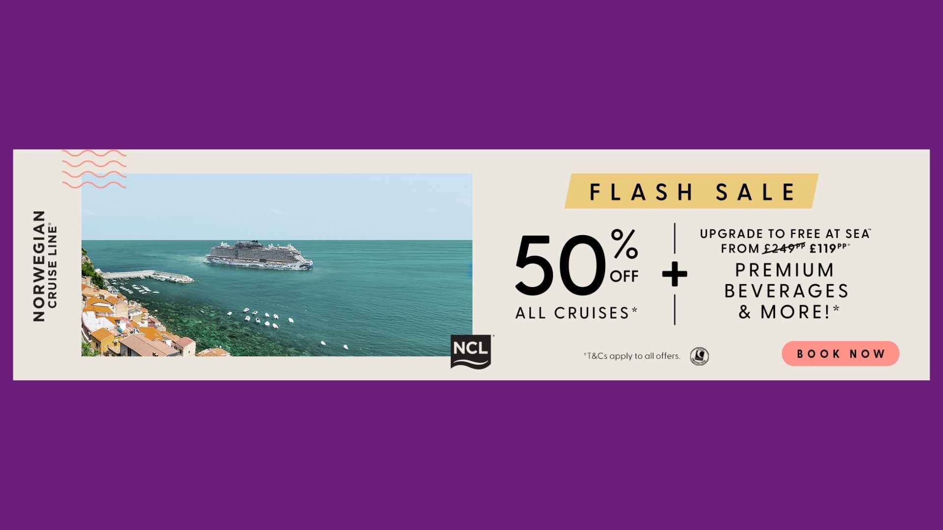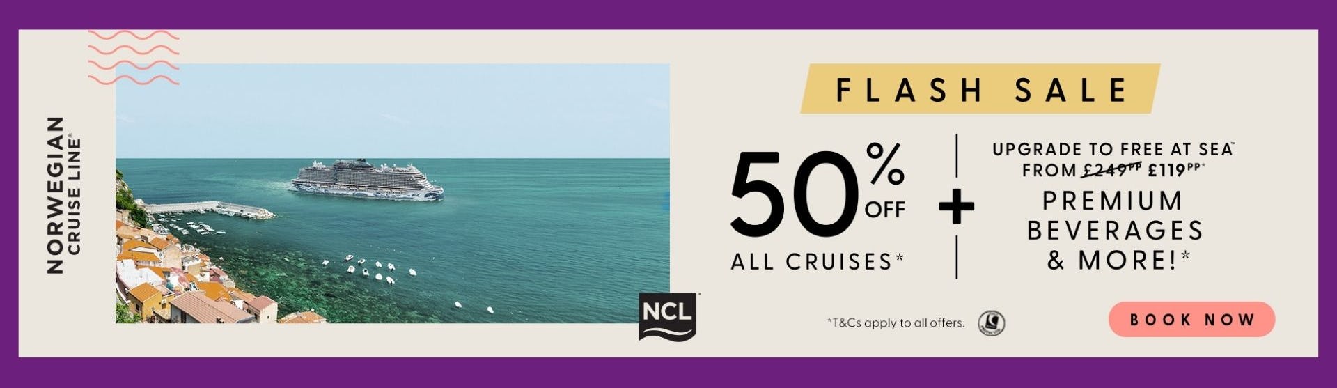 Now’s the perfect time to book the itinerary you’ve always wanted and save big with 50% off all cruises with NCL. And during this Flash Sale, you can upgrade to Free at Sea™ for half price - just £119pp on 7–8 day cruises (original price is £249pp).